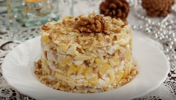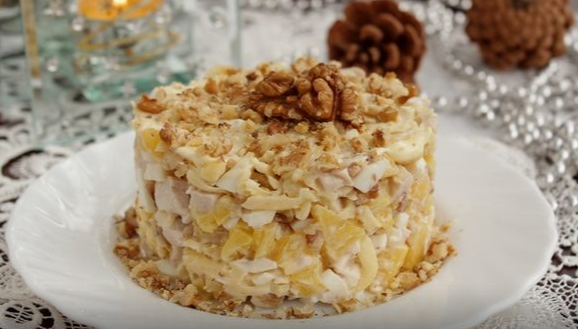 Салат с курицей, ананасами и орехами